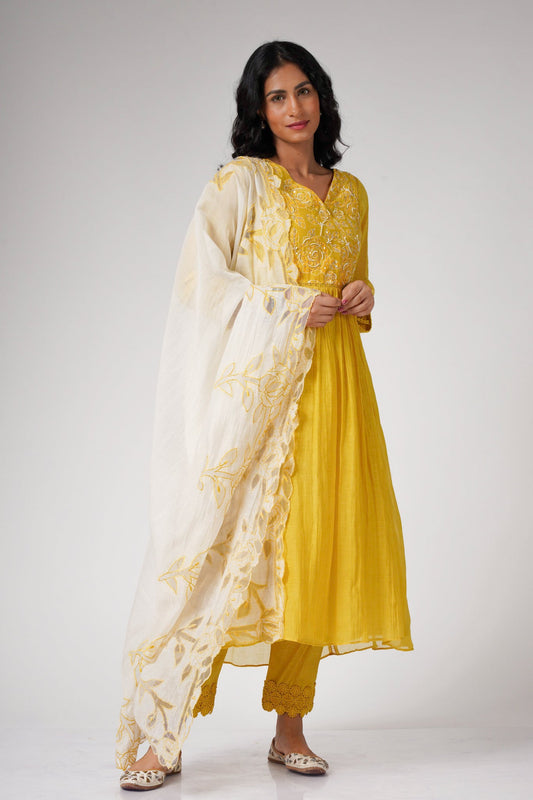 Shazana- Sunset Yellow Front Pleated Suit Set with Mukaish Work